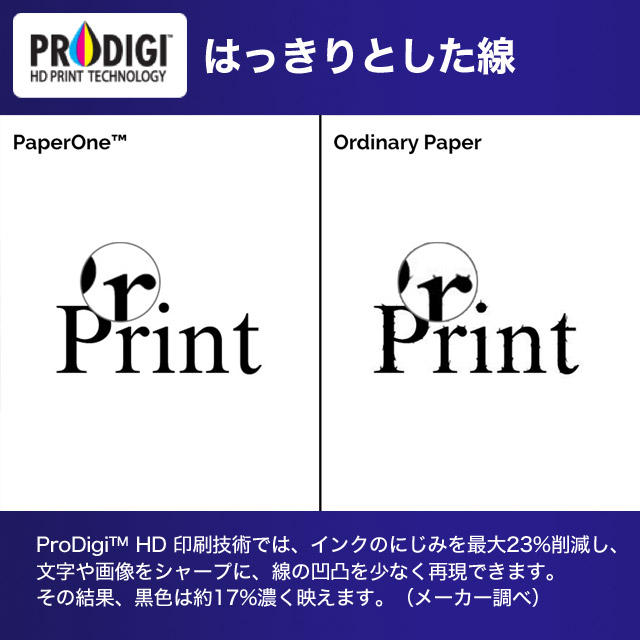 ProDigi(TM) HD 印刷技術では色の鮮やかさを約34%向上させ、シャープなインク使用をするため、他の用紙に比べてインクが定着しやすくなります。(メーカー調べ)