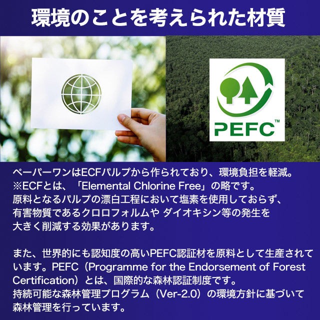 ペーパーワンは、世界的にも認知度の高いPEFC認証材を原料として生産されています。