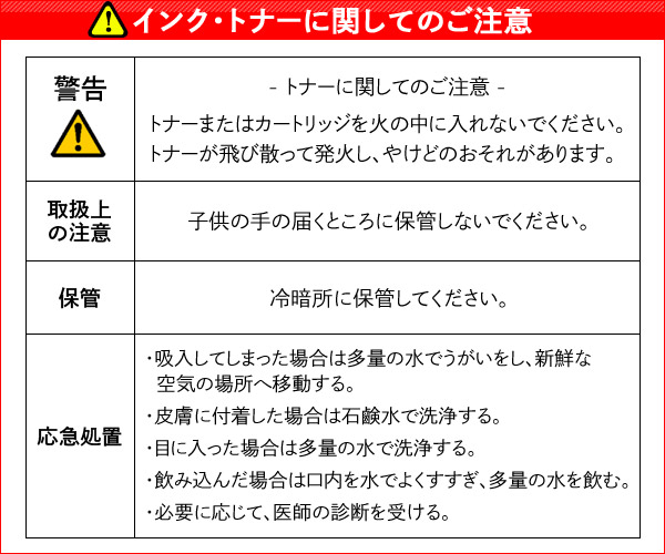 トナーが飛び散って発火し、やけどのおそれがあります。子供の手の届くところに保管しないでください。冷暗所に保管してください。