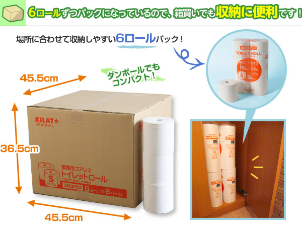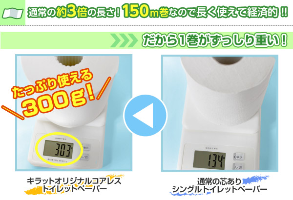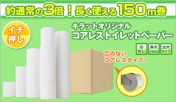 ホテル等で使われている業務用!超ロングタイプ150mで通常の3倍!省スペース・省コストで大人気商品です。ロール芯がないのでゴミが1つ減らせます。