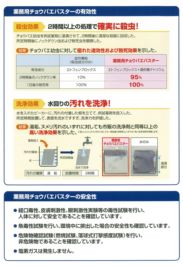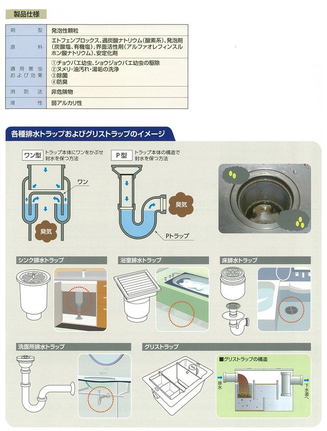 チョウバエ幼虫、ショウジョウバエ幼虫の駆除、ヌメリ、油汚れ、湯垢の洗浄、除菌、防臭