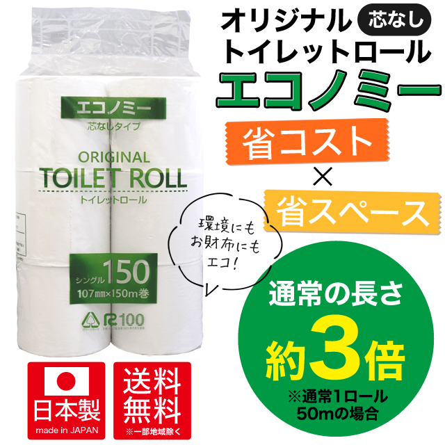 【送料弊社負担】オリジナルトイレットペーパー エコノミー シングル 芯無し 150m 8パック(48ロール)【他商品と同時購入不可】