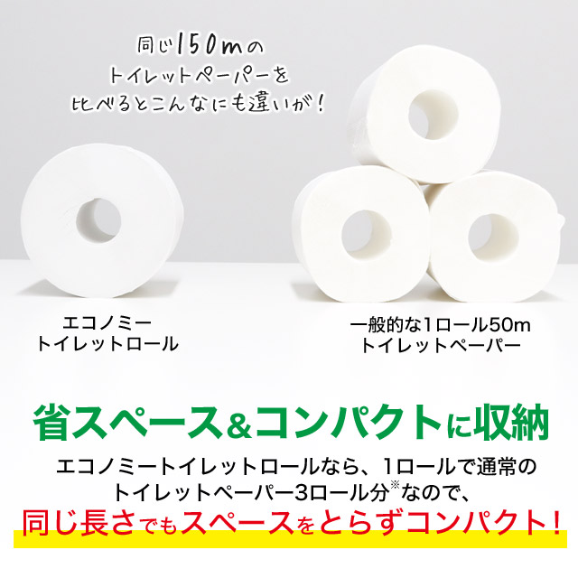 長さはたっぷりの150m巻なのに、ロールの大きさは家庭用トイレットペーパーと同じ!