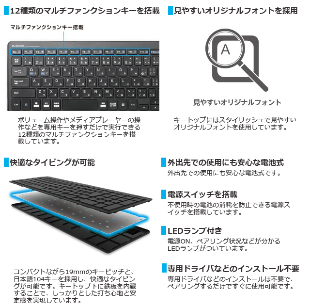 コンパクトながら19mmのキーピッチと日本語104キーを採用し、快適なタイピングが可能です。