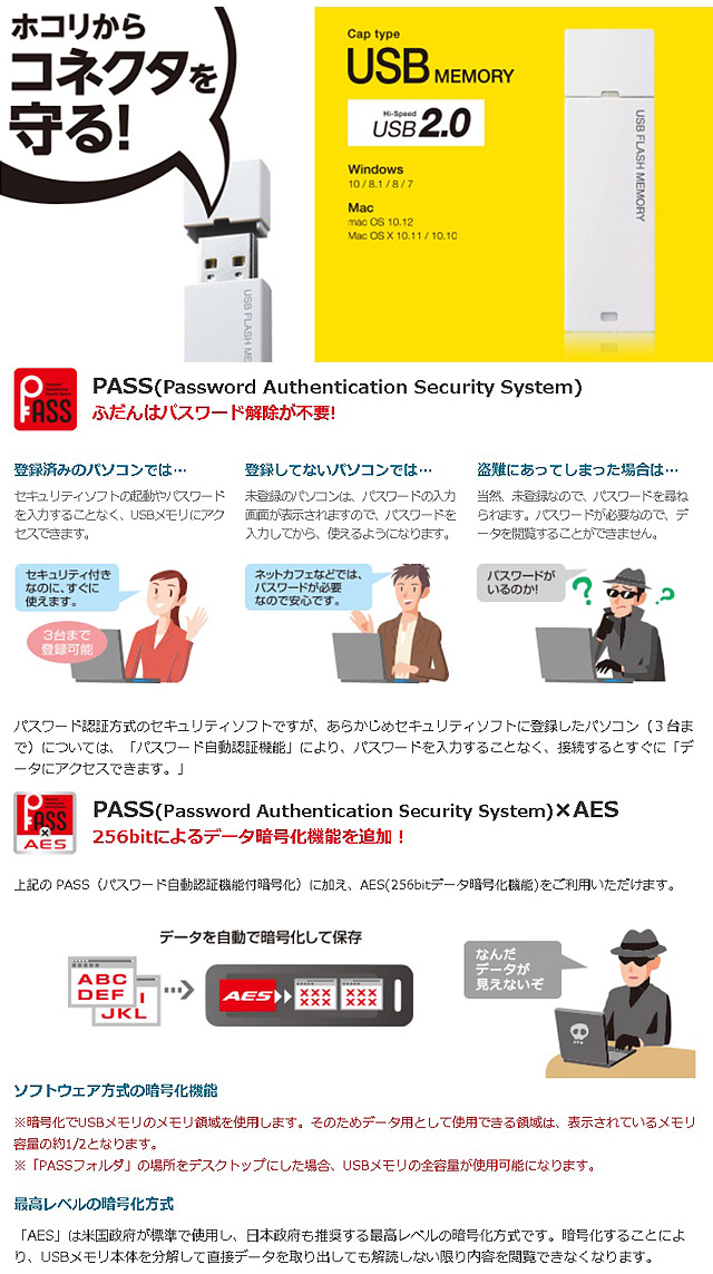 エレコムWebサイトからダウンロードすることで、パスワード自動認証機能付暗号化セキュリティソフト「PASS×AES」あるいは「PASS」のみでの使用が可能です。