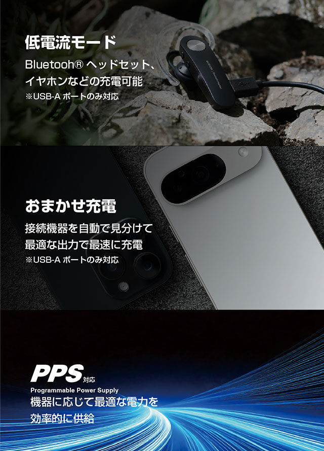 ・電源出力側:USB Type-Cポート×2、USB-Aポート×1