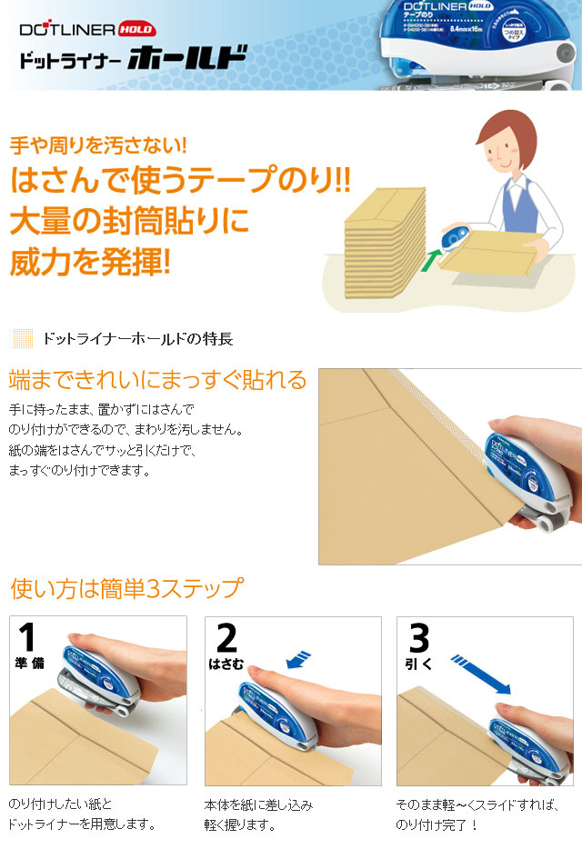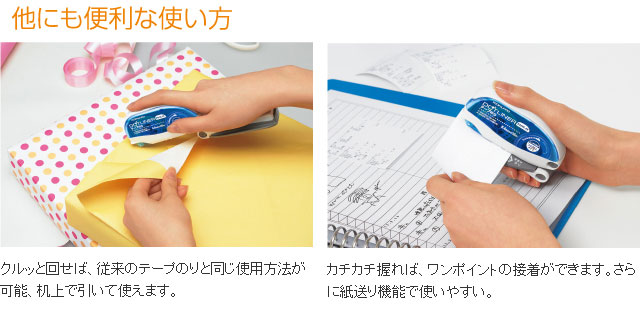 ●手に持ったまま、置かずにはさんでのり付けができるので、まわりを汚しません。