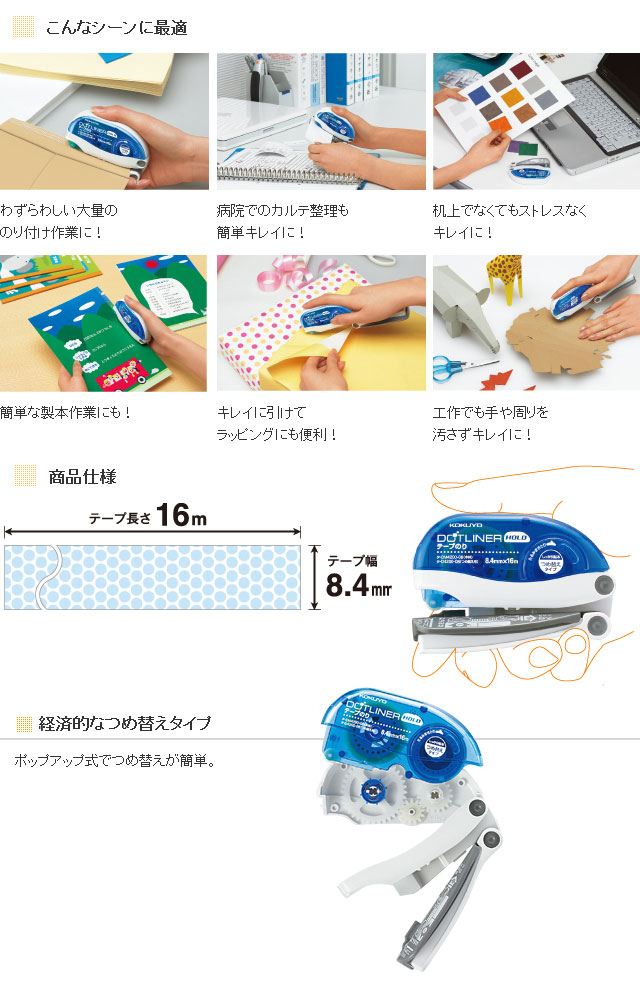 ●のりの糸引きがなく、きれいにピタッと貼れます。また軽い引き心地と確実なのり付けで作業もラクラク。