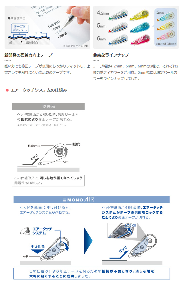 テープの供給をコントロールする新機構「エアータッチシステム」を搭載。テープを切るための抵抗が不要となり、消し心地が驚くほど軽くなりました。