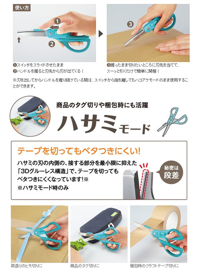 ●ハコアケモードは、本体のスイッチをスライドしながら握ると出てくる約1mmの刃によって、ハサミの刃を閉じたまま段ボールの開梱できるモードです。
