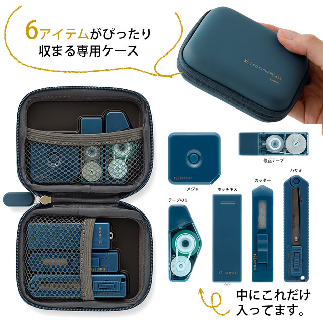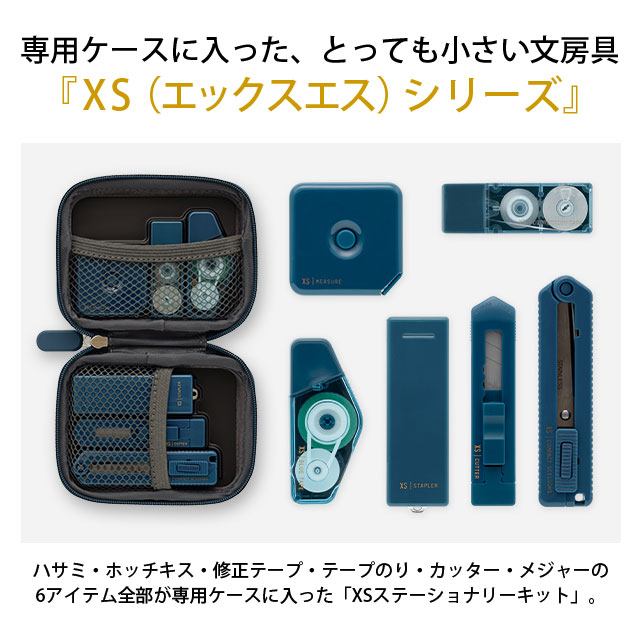 とっても小さい文房具、XSシリーズの「ハサミ」・「ホッチキス」・「修正テープ」・「テープのり」・「カッター」・「メジャー」の6アイテムが専用ケースに入ったステーショナリーキットです。