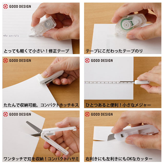- ◆セット内容/専用ケース、コンパクトハサミ、コンパクトホッチキス、修正テープ、テープのり、カッター、メジャー(1.5m)