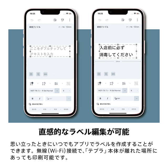 2つのテプラPRO用アプリ「Hello」「TEPRA LINK 2」(※2)とBluetoothで接続して、お手持ちのスマホから簡単にラベルを作ることができます。