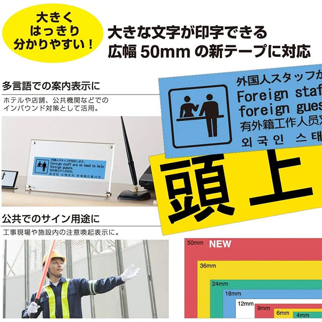 大きな文字が印字できる広幅50mmのテープは、公共表示や製造現場の各種表示に最適です。