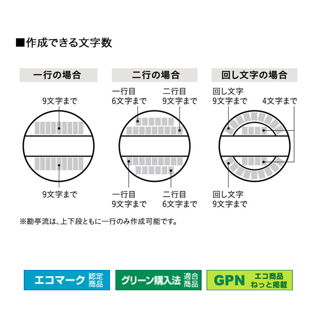 ●回し文字(円弧)の場合、上下段ともに回し文字9文字まで、内側4文字まで