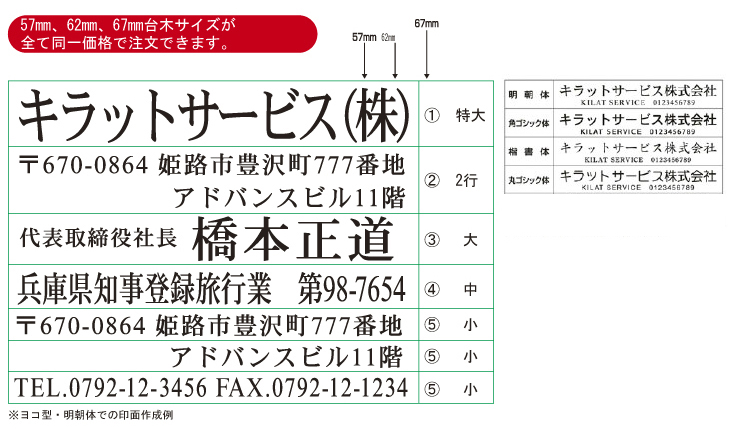 ※最大文字数(目安):各行/住所:22文字(郵便番号除く)、TEL・FAX番号:33文字、漢字:26文字
