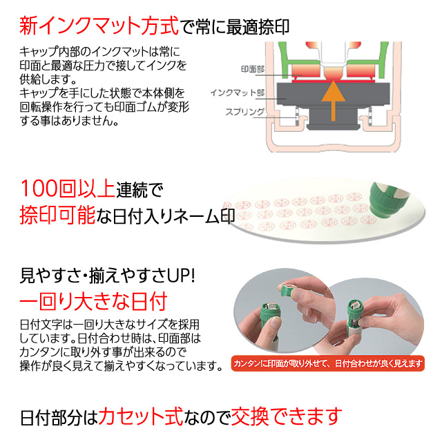 新インクマット方式で、キャップ内部のインクマットは常に印面と最適な圧力で接してインクを供給。