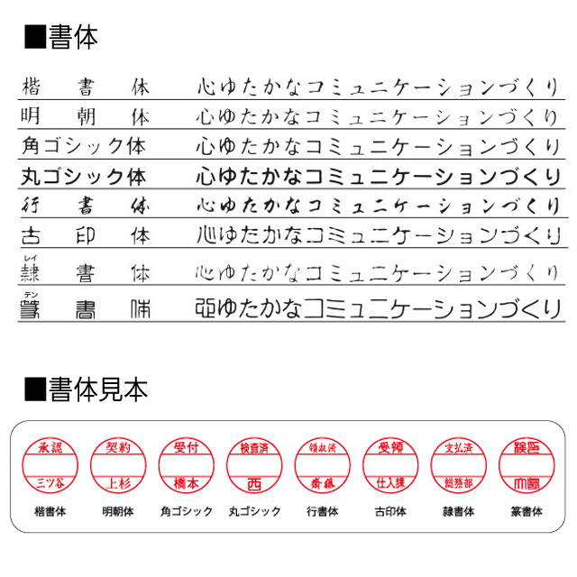 楷書体・明朝体・角ゴシック体・丸ゴシック体・行書体・古印体・隷書体・てん書体