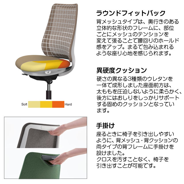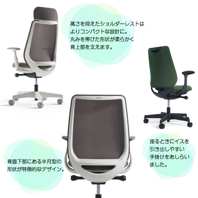 背もたれの内部に採用した樹脂シェルのグリッドが、背中の動きにあわせて変形するため、長時間のハードワークでも快適です。