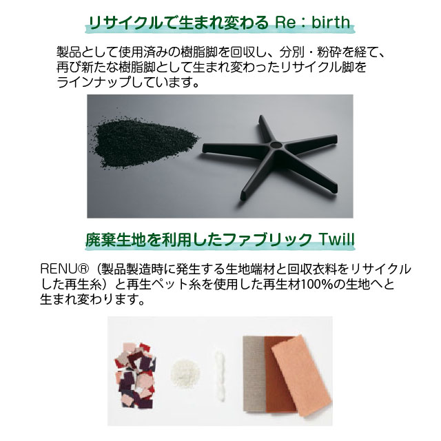 不要になった端材から生まれた張材の活用や、リサイクル樹脂脚を採用することで循環型経済を実現しました。