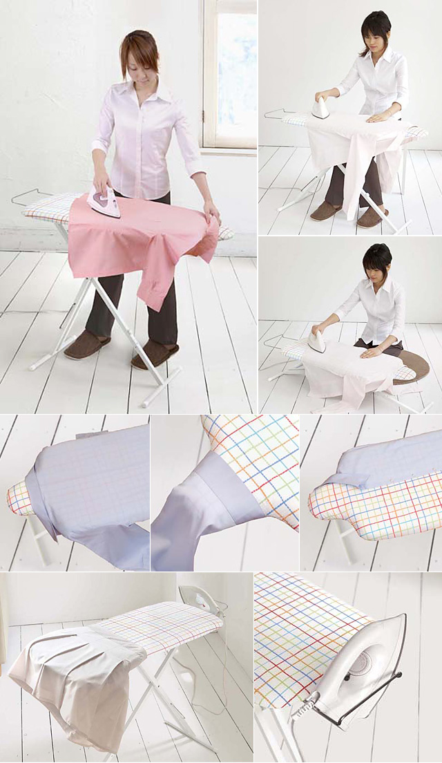 立っても座っても、楽な姿勢で掛けられるスタンド式アイロン台。