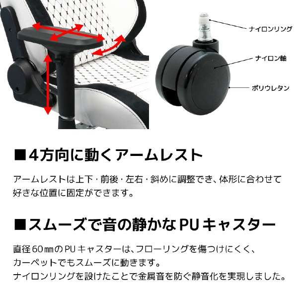 アームレストは4方向(上下・前後・左右・斜め)に調節でき、自分好みの位置に固定が可能です。