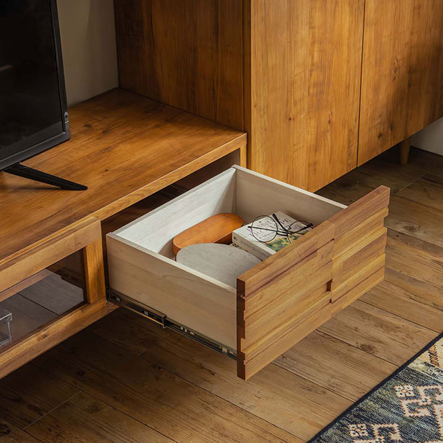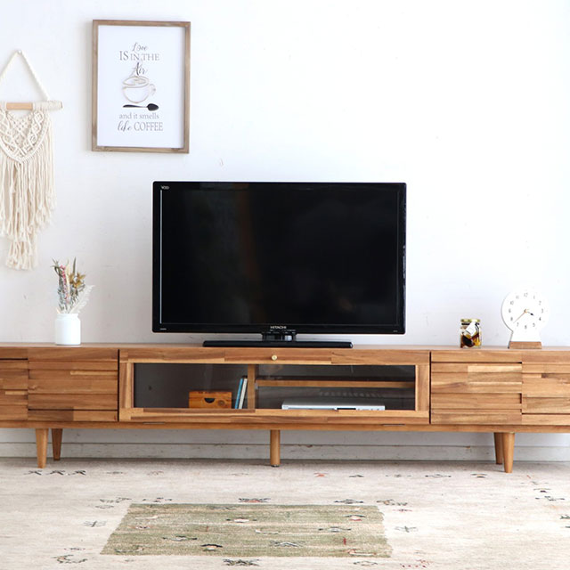ガラスの抜け感と無垢の凹凸感がオシャレなローボードです。