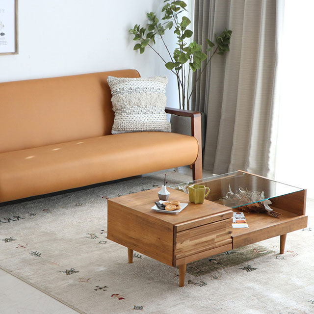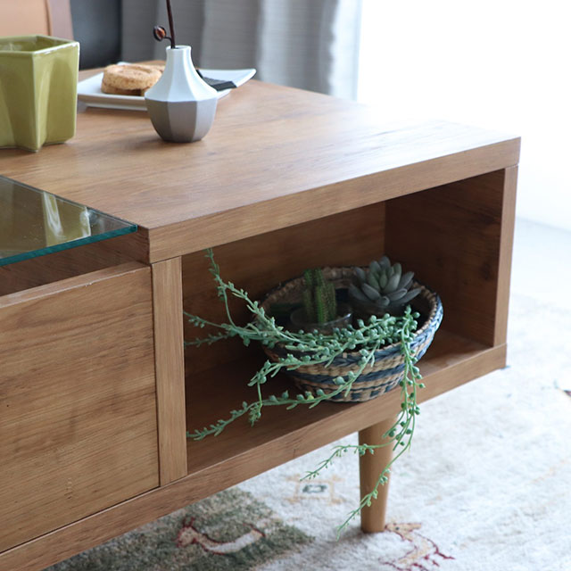 ガラスの抜け感と無垢の凹凸感がオシャレなリビングテーブルです。