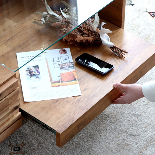 ガラス天板の下はスライド棚になっており、中のものを楽に出し入れできます。