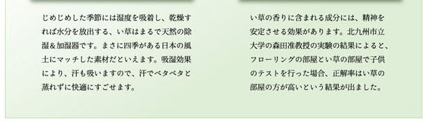 ■い草には空気の自然浄化作用、湿度の調節作用などがあります。また汚れにくく、使用するうちに黄金色に変化し味が出ます。