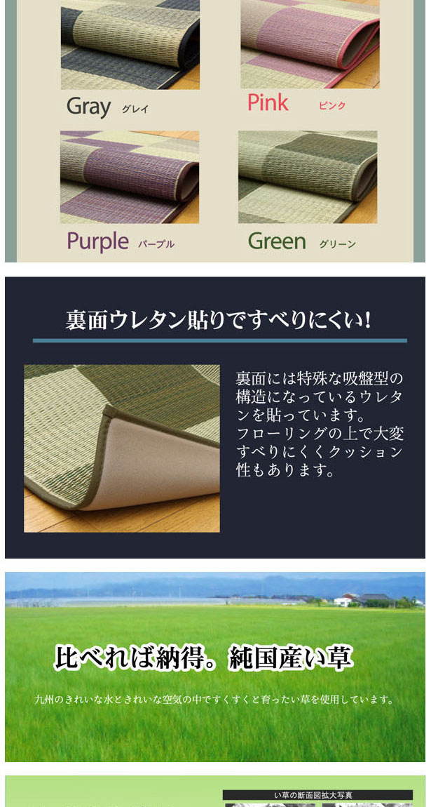 ■い草には空気の自然浄化作用、湿度の調節作用などがあります。また汚れにくく、使用するうちに黄金色に変化し味が出ます。