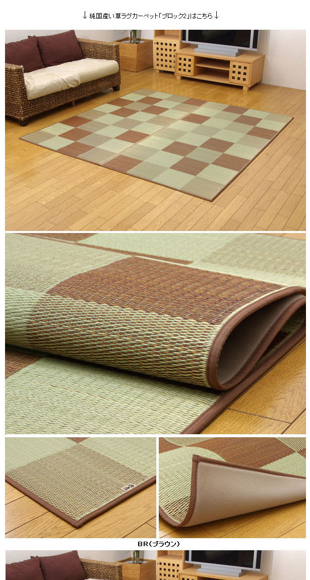 ■シンプルで飽きのこないブロック柄のい草カーペットです。国産(九州産)のい草を使用しています。一本一本が太く、表皮が厚く繊維がキメ細かいので弾力性があり、耐久性に優れています。