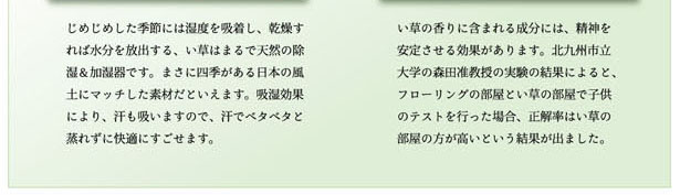 ■い草には空気の自然浄化作用、湿度の調節作用などがあります。また汚れにくく、使用するうちに黄金色に変化し味が出ます。