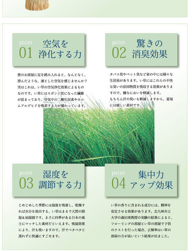 ■い草には空気の自然浄化作用、湿度の調節作用などがあります。また汚れにくく、使用するうちに黄金色に変化し味が出ます。