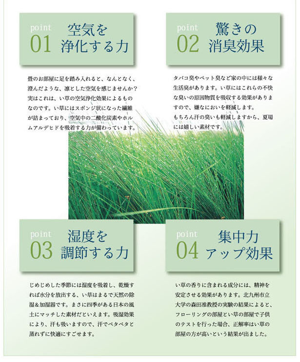 ■い草には空気の自然浄化作用、湿度の調節作用などがあります。また汚れにくく、使用するうちに黄金色に変化し味が出ます。