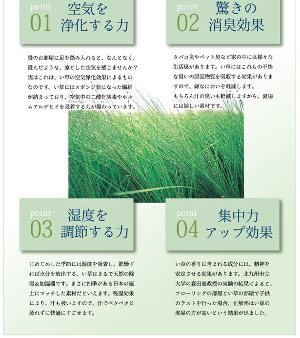 ■い草には空気の自然浄化作用、湿度の調節作用などがあります。また汚れにくく、使用するうちに黄金色に変化し味が出ます。