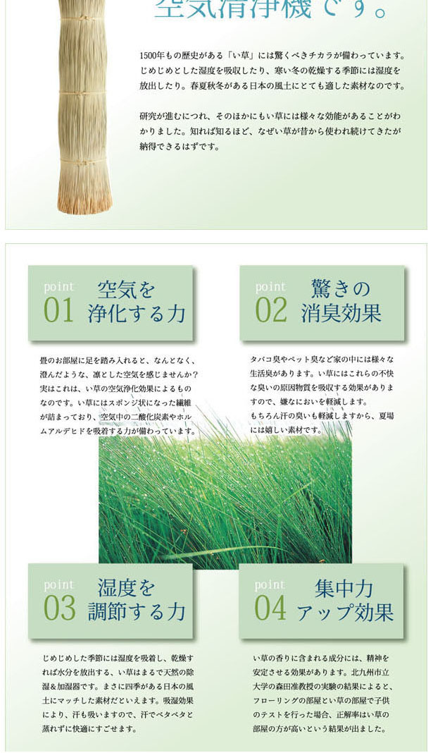 ■い草には空気の自然浄化作用、湿度の調節作用などがあります。また汚れにくく、使用するうちに黄金色に変化し味が出ます。