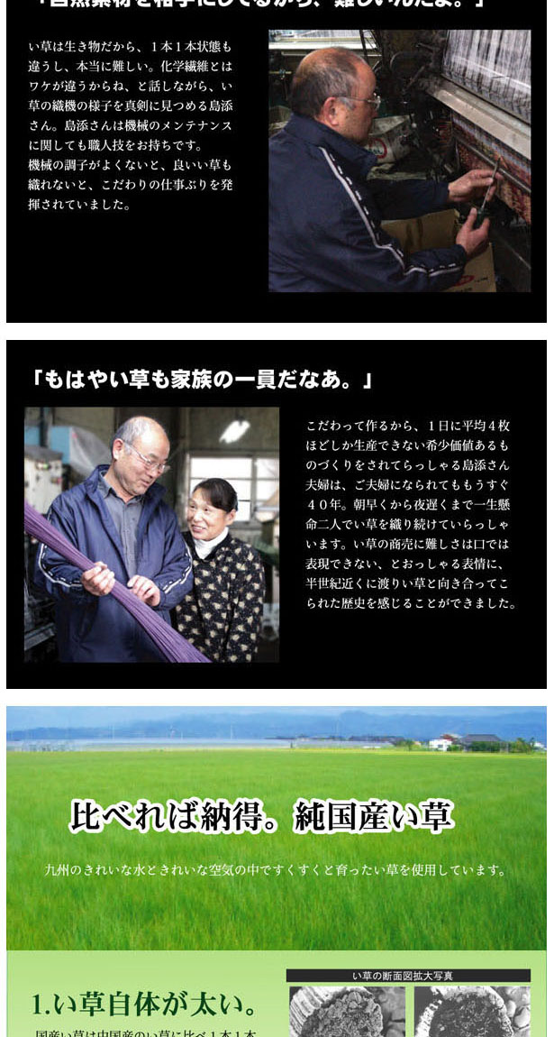 ■国産(九州産)のい草を使用しています。一本一本が太く、表皮が厚く繊維がキメ細かいので弾力性があり、耐久性に優れています。