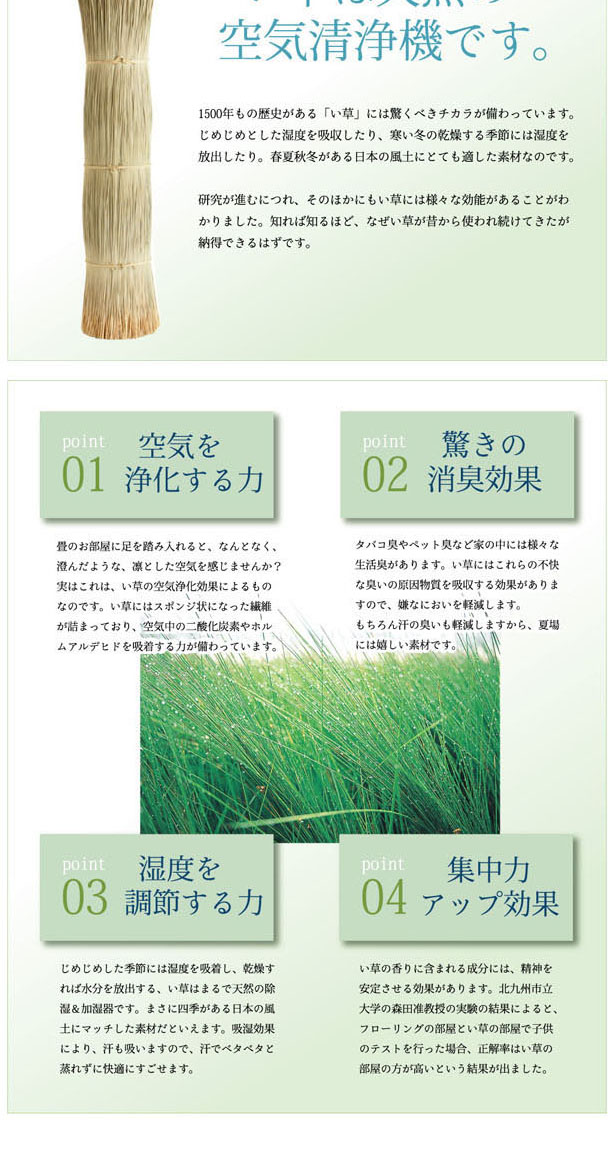 ■い草には空気の自然浄化作用、湿度の調節作用などがあります。また汚れにくく、使用するうちに黄金色に変化し味が出ます。