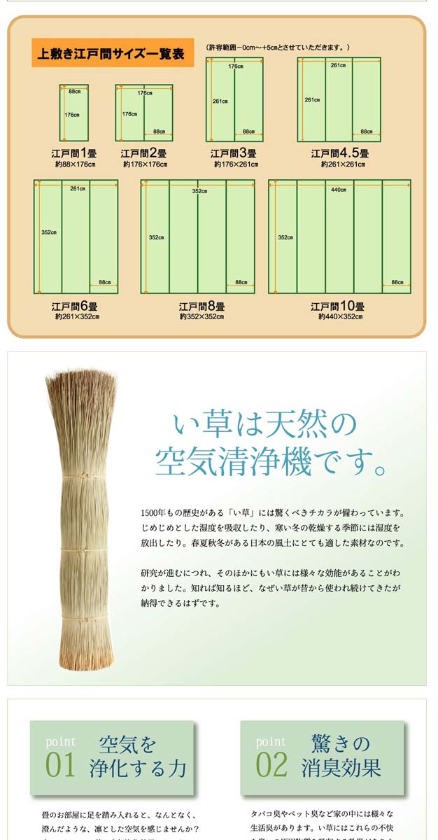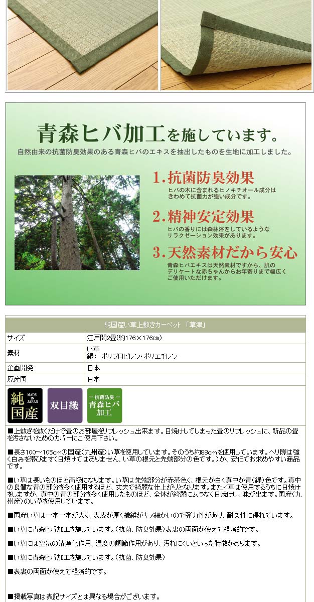 - 素材:い草(九州産) ※双目織 ヘリ=ポリプロピレン、ポリエチレン