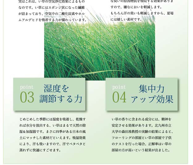 い草には空気の清浄化作用、湿度の調節作用があり、汚れにくいといった特徴があります。
