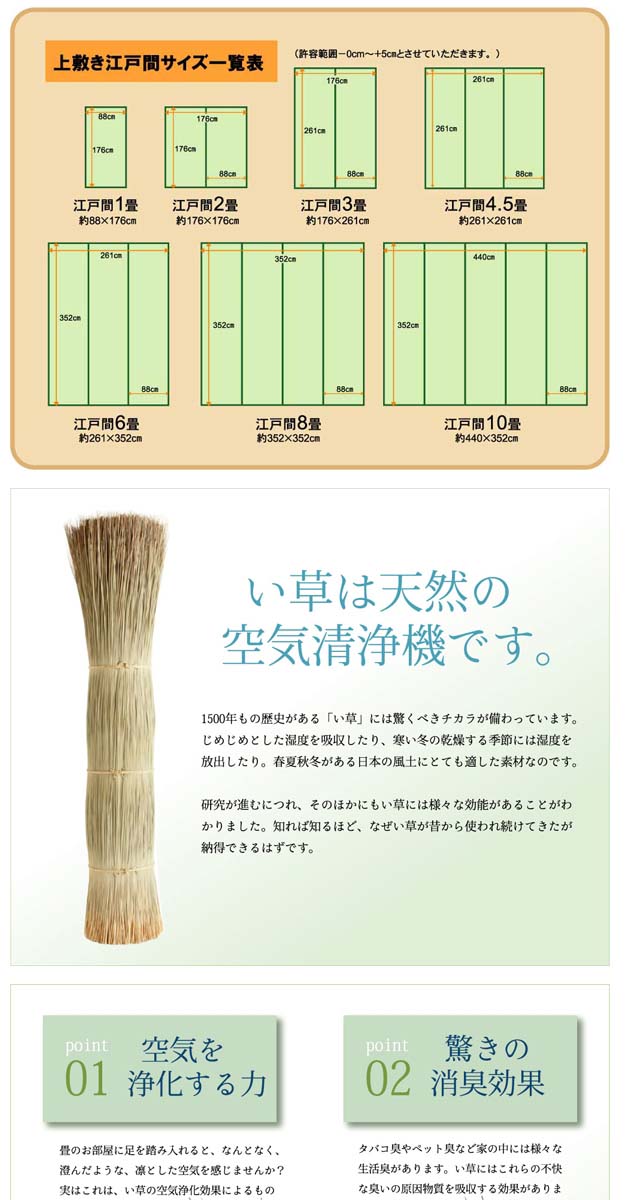 - 素材:い草(九州産) ※双目織 ヘリ=ポリプロピレン、ポリエチレン