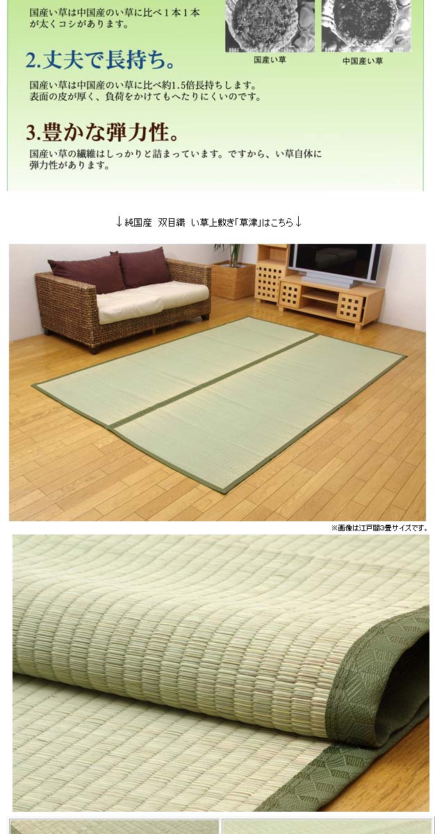 国産い草は一本一本が太く、表皮が厚く繊維がキメ細かいので弾力性があり、耐久性に優れています。