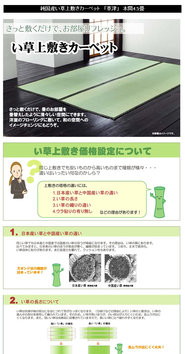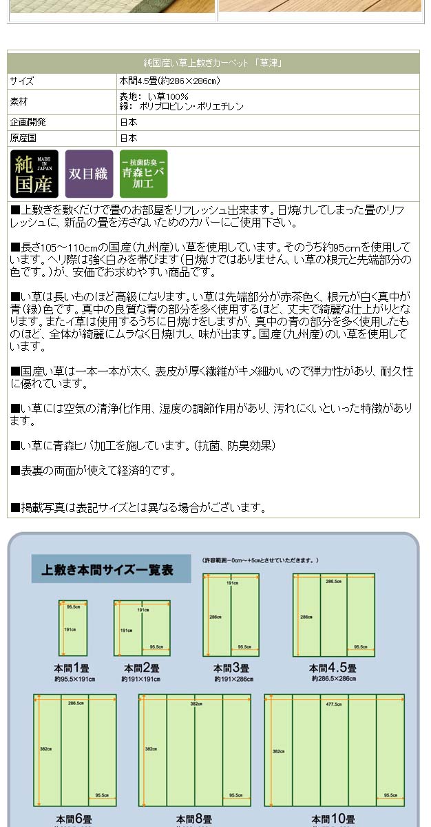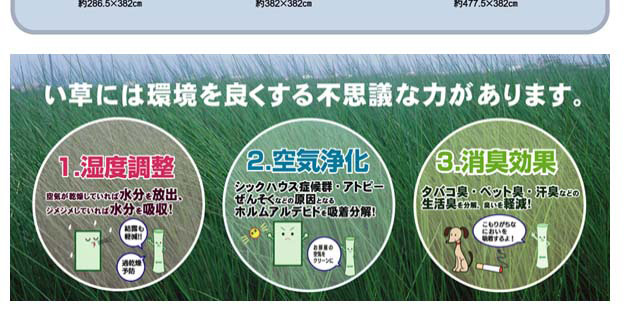 - 素材:い草(九州産) ※双目織 ヘリ=ポリプロピレン、ポリエチレン