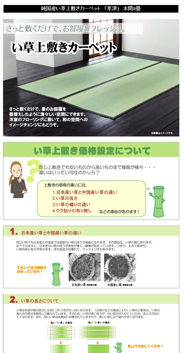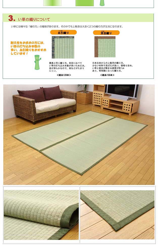 - 素材:い草(九州産) ※双目織 ヘリ=ポリプロピレン、ポリエチレン