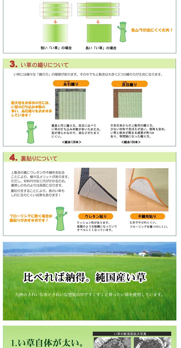 国産い草は一本一本が太く、表皮が厚く繊維がキメ細かいので弾力性があり、耐久性に優れています。