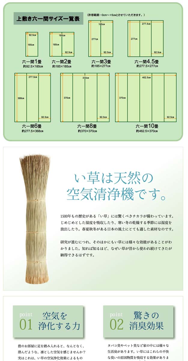 - 素材:い草(九州産) ※双目織 ヘリ=ポリプロピレン、ポリエチレン