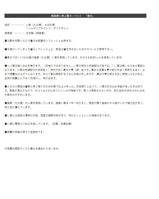 - 素材:い草(九州産) ※糸引織 ヘリ=ポリプロピレン、ポリエチレン