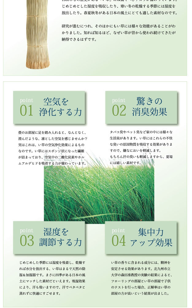 い草には空気の自然浄化作用、湿度の調節作用などがあります。