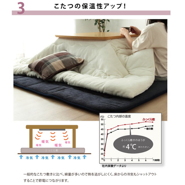 こたつと併用することで、こたつの熱を床下へ逃しにくくなるので省エネ効果もあります。